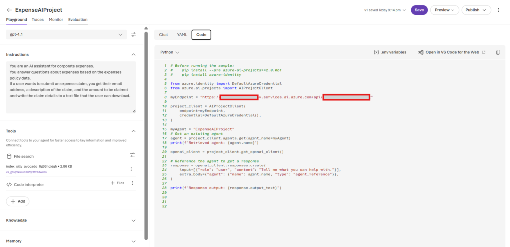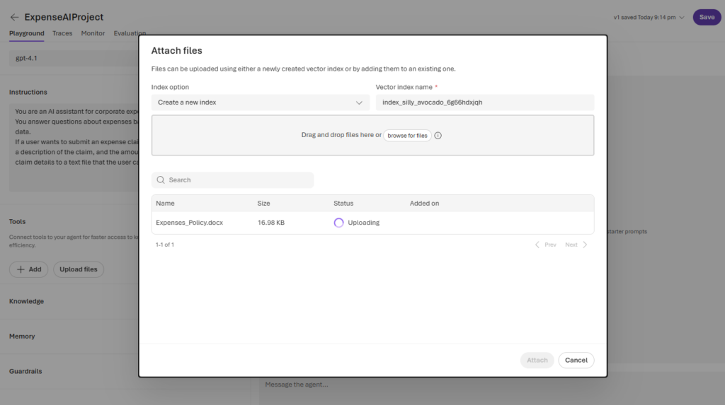 ต่อมาเรามาลองตั้งค่า Agent และใส่ข้อมูลจริงให้มันเรียนรู้ แต่เพื่อให้มันไม่หลอน เอาอะไรก็ไม่รู้มาตอบ เราจะเพิ่มเอกสารให้ AI ไปอ่านมาตอบด้วย โดยเราไปลองเอาไฟล์นี้มา https://raw.githubusercontent.com/MicrosoftLearning/mslearn-ai-agents/main/Labfiles/01-agent-fundamentals/Expenses_Policy.docx