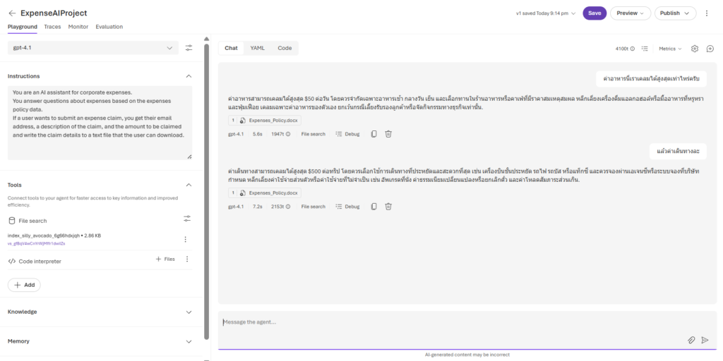 Agent จะตอบจากเนื้อหาในไฟล์ Policy ที่เราให้มันเรียนรู้ ต่อมาเรามาดูตัวอย่างที่ให้ Agent มันใช้ Code Interpreter กันบ้าง