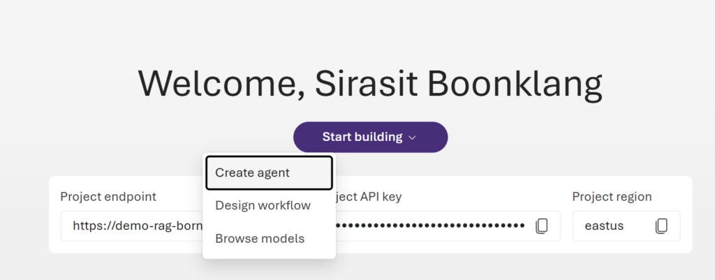 ต่อไปเรามาสร้างโปรเจกต์ใหม่ กด Start building แล้วเลือก Create agent