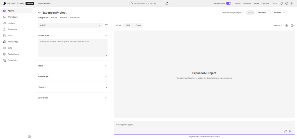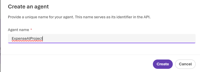 ตั้งชื่อโปรเจกต์ เช่น ExpenseAIProject โดยตัวอย่างนี้แอด เอามาจากลิงก์นี้นะครับ https://learn.microsoft.com/en-us/training/modules/ai-agent-fundamentals/5-exercise