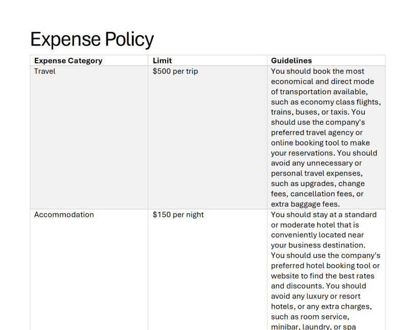 You answer questions about expenses based on the expenses policy data.
