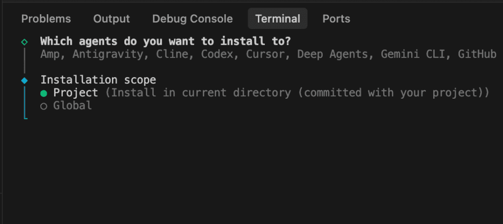จากนั้นให้เราเลือก Agent ที่ต้องการจะติดตั้ง และพื้นที่ที่เราต้องการจะติดตั้ง หากใครที่ไม่อยากติดตั้งซ้ำซ้อนก็เลือกเป็น Global ได้เลย แต่หากใครกลัวปวดหัวกับการใช้งาน หรืออยากติดตั้งเฉพาะจุดก็สามารถเลือกเป็น Project Scope ก็ได้