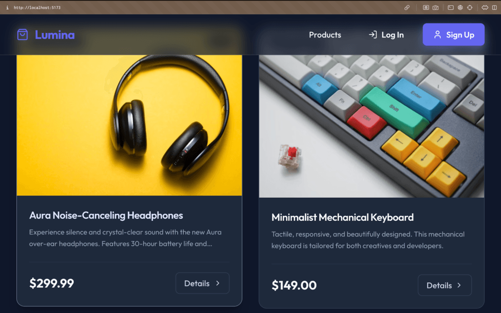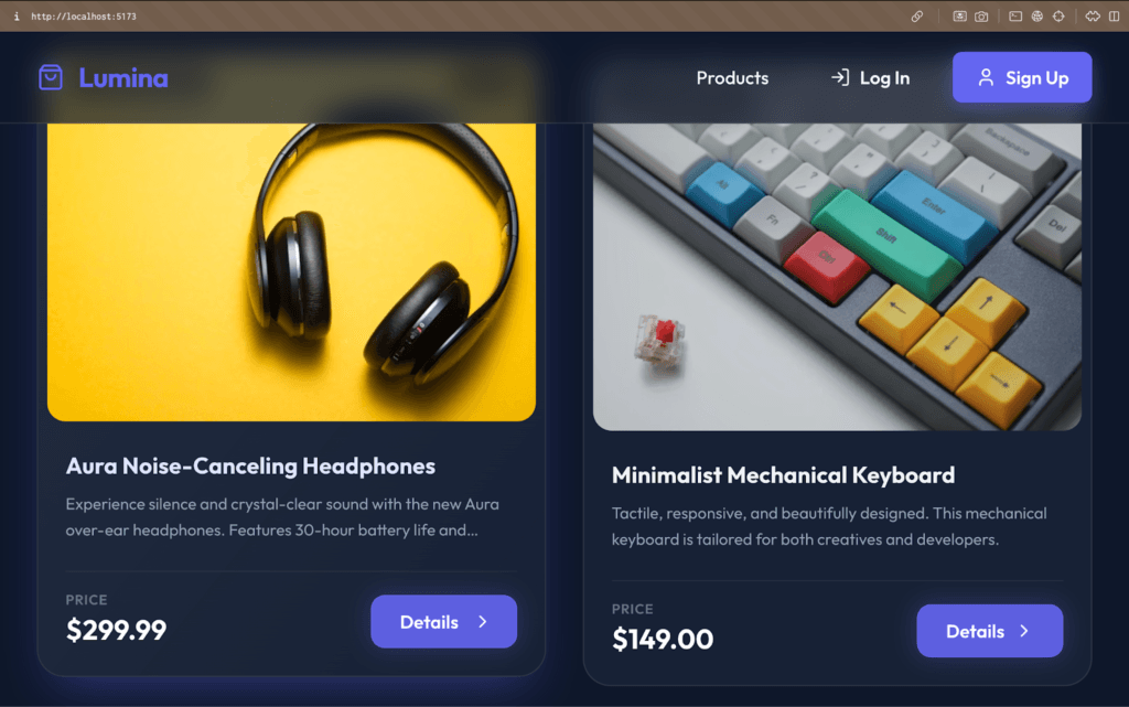 จากภาพเป็นตัวอย่างรายการสินค้าในระบบ ซึ่งในภาพแอดได้เอาเมาส์ hover ตัวหูฟังเอาไว้ จะเห็นว่ามีขอบจะมีแสงสีฟ้า ๆ ออกมาจากพื้นหลังเล็กน้อย ปุ่ม Details ตั้งเป็นสี และขอบส่วนใหญ่เป็นขอบแบบโค้งมน ทำให้มันดูเป็น AI มากเกินไป และเราสามารถปรับปรุงส่วนนี้ให้ดู modern ขึ้นได้ครับ