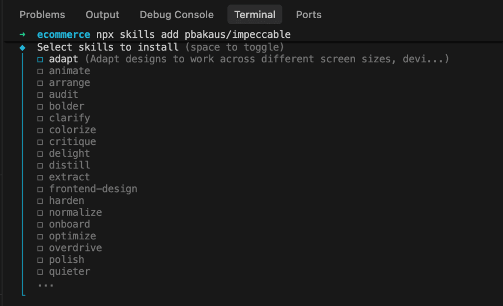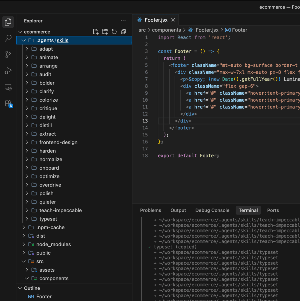เมื่อเราติดตั้งเสร็จเรียบร้อย เราจะเห็นได้ว่ามี folder ./agents/skills ที่จะมีข้อมูล foldre หลาย ๆ อัน หากใครจำได้ชื่อ folder เหล่านี้ก็คือชื่อ function ที่เราได้ติดตั้งมาก่อนหน้านี้นั่นเองครับ เท่านี้ก็จะเสร็จสิ้นการติดตั้งเจ้า Impeccable เรียบร้อยครับผม
