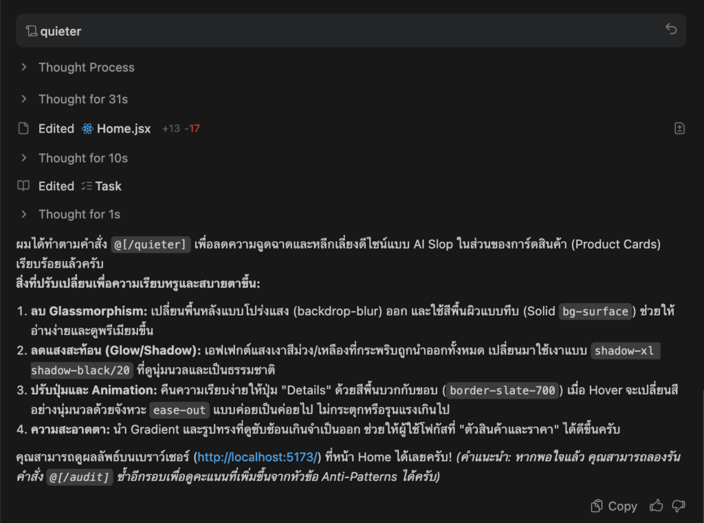 เดี๋ยวแอดจะลองแก้ตามที่ AI แนะนำสัก 1 อัน เอาที่เห็นภาพง่ายจะเป็นตัว card สินค้าที่ดูเรืองแสงเกินจำเป็น เราก็สามารถแก้ไขประเด็นนี้ด้วยการพิมพ์แค่ /quiter แล้วก็รอ AI ทำงานได้เลย