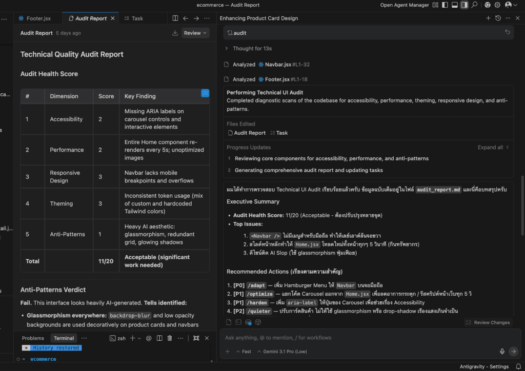หลังจากเราใช้ AI ตรวจ code แล้วก็จะเห็นว่ามีข้อสรุปมาให้ว่าเว็บของเราควรแก้อะไรที่ส่วนไหนบ้าง และที่สำคัญ AI บอกมาด้วยว่าจะใช้คำสั่งอะไรบ้างในการแก้ไข ทำให้เราไม่ต้องไปหาโค้ดหรือสั่ง AI เอง และ AI ยังสรุปให้เรามาอ่านแบบละเอียดเป็นไฟล์ที่ชื่อ Audit Report อีกด้วยครับผม